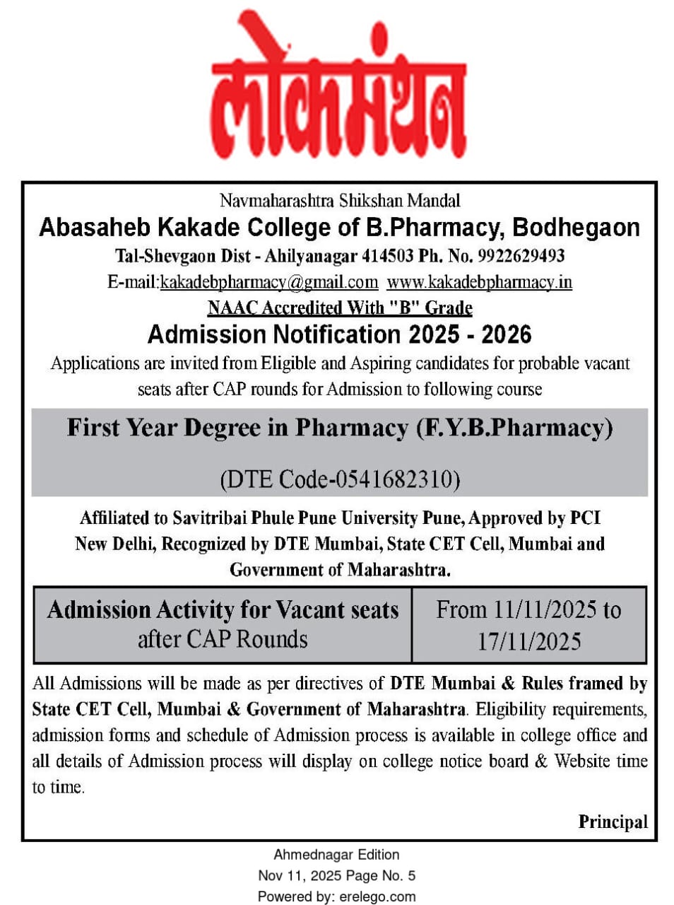 Navmaharashtra Shikshan Mandal's Abasaheb Kakade College of B. Pharmacy, Bodhegaon is approved by Pharmacy Council of India (PCI), New Delhi, Govt. of Maharashtra (Ministry of Higher and Technical Education) and Directorate of Technical Education, Mumbai, and is affiliated to Savitribai Phule Pune University, Pune. Established in 2013–2014 with an intake of 60 students for the B. Pharmacy program.